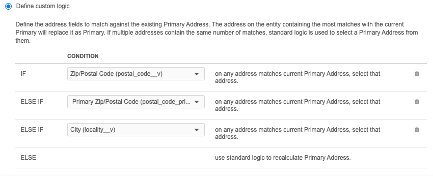 Run the custom condition logic - If the first condition is met, then the address with the condition is the new primary address. If multiple addresses match the conditions, the address with the most matches is the new primary address. If the condition is not met, move on to the next condition.