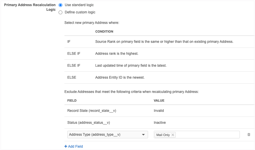 In the Primary Address Recalculation Logic section, choose one of the options: