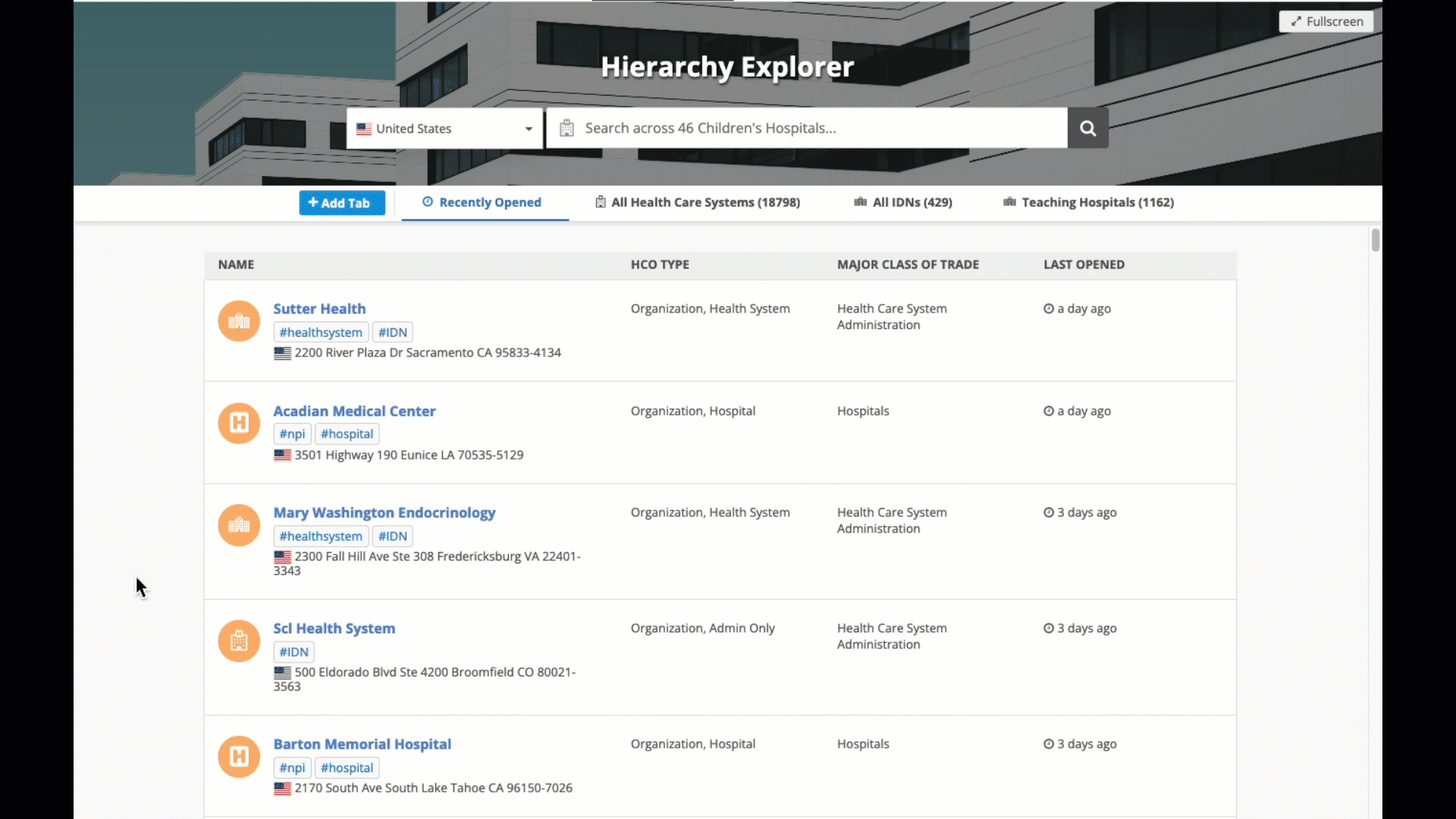 Hierarchy Explorer is a Network widget that you can use to see all levels of an HCO's structure, making it easy to visualize their hierarchy and find new targets.