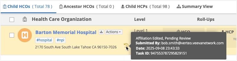 If you submitted the change, a DCR is created and sent to Network. The HCO remains highlighted in yellow and displays a yellow Pending Review
