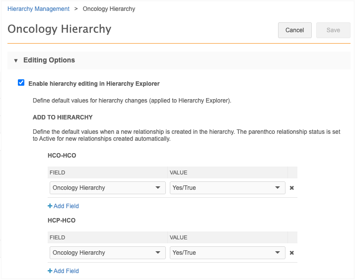 For example, set the Oncology Hierarchy field to Yes/True and the Relationship Type field value to Affiliation when users add HCO-HCO relationships.
