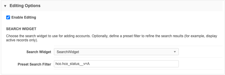 Optionally add a Preset Search Filter. For example, to ensure that only active HCOs can be added as affiliations, define the following filter: hco.hco_status__v=A. When users access the Search widget from Hierarchy Explorer, the results will display active HCOs only.