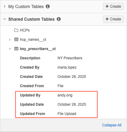 Updated By - Method the table was updated. The value is always File Upload even if the table was created from a reporting query or transformation query.