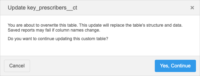 A pop-up displays to advise that you are overwriting the table and that any saved reports might fail if column names change.