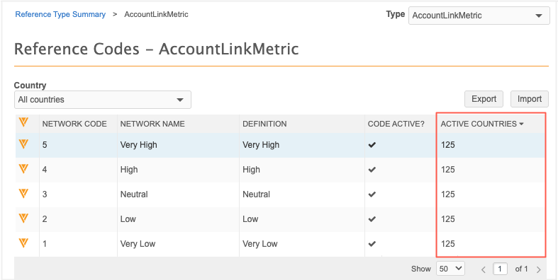 The Reference Codes page now displays the exact number of active countries for each code. This replaces the previous checkmark icon, providing a clearer view of country coverage at a glance. As always, Administrators and Data Managers can click the code to view the full list of active countries.