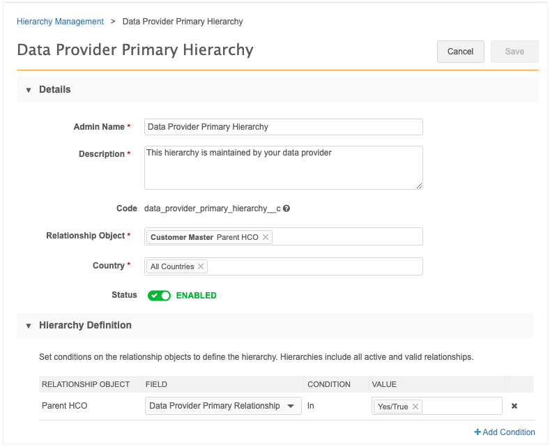 Setting Definition Default Value Admin Name The name of the hierarchy definition. Data Provider Primary Hierarchy Description A meaningful description of the hierarchy definition. This hierarchy is maintained by your data provider. Relationship Objects The relationship objects to this hierarchy definition. Parent HCO Country The countries that apply to this hierarchy rollup definition. All Countries -