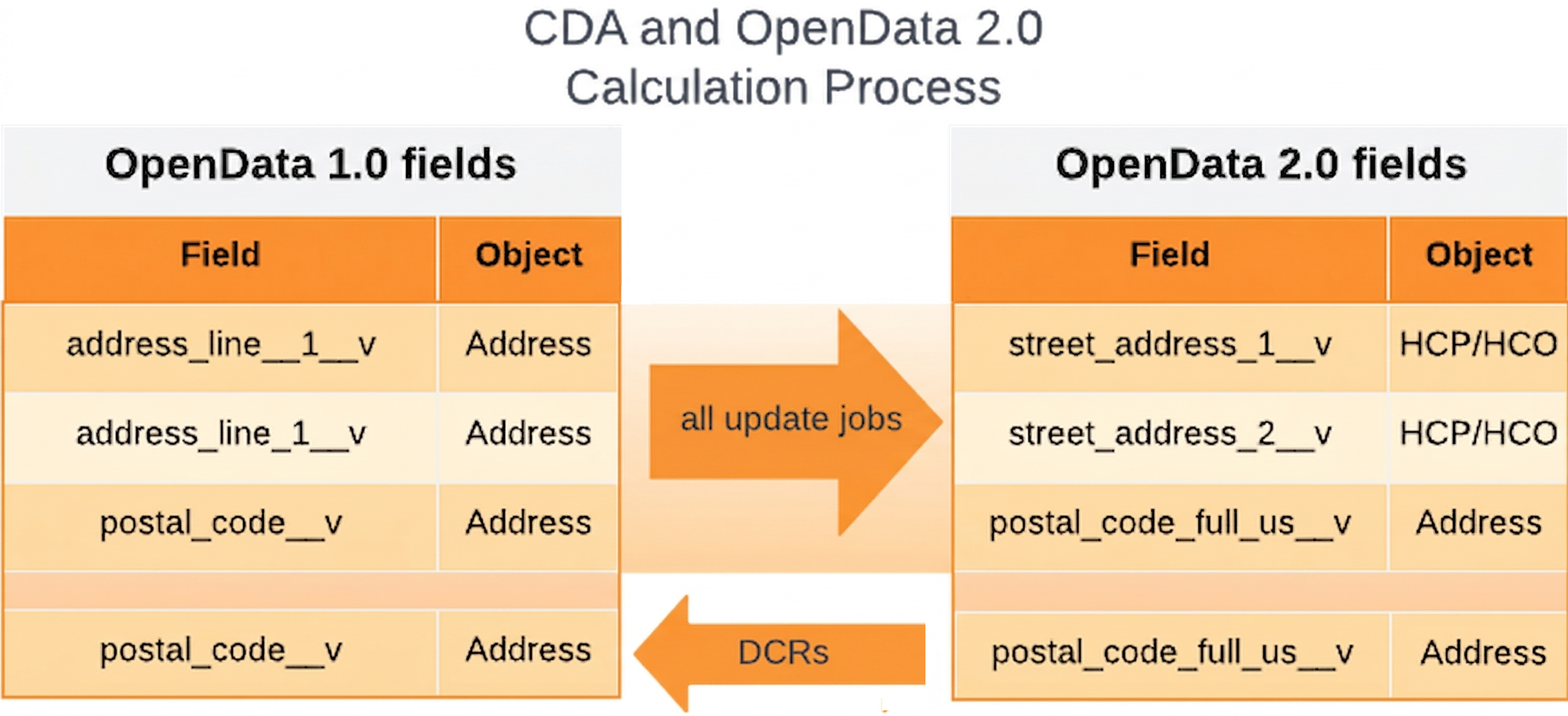 Note: If the CDA and OpenData 2.0 Calculation setting is off, changes processed for the street_address_1__v, street_address_2__v, or postal_code_full_us__v fields will not update their mapped OpenData 1.0 fields. The values between the fields could become different.