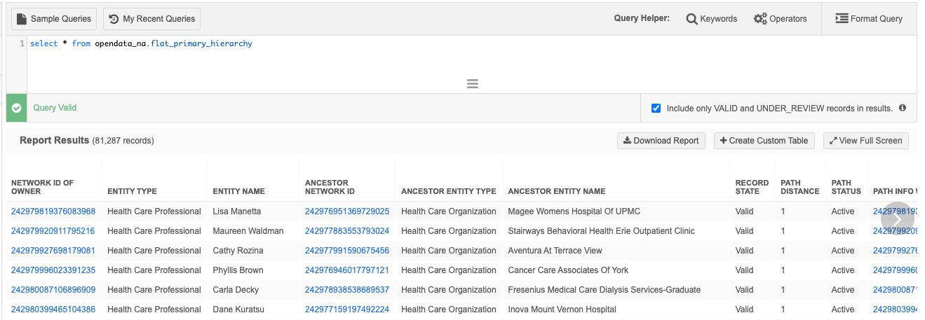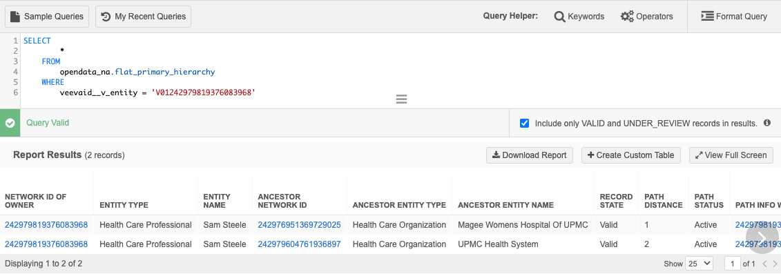 Query the table to display the flat primary hierarchy for a specific HCP.